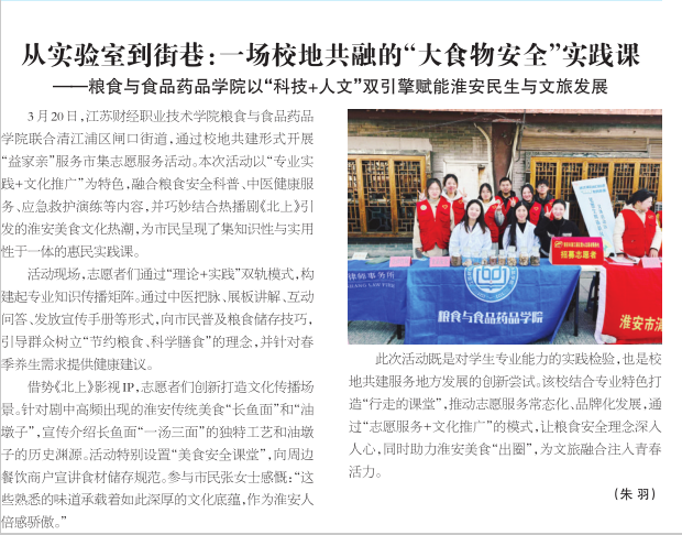 3月20日,江苏财经职业技术学院粮食与食品药品学院分团委、学生党支部及志愿者团队走进清江浦区闸口街道,开展以“守护粮食安全、弘扬传统文化、服务社区民生”为主题的系列志愿服务活动。此次活动涵盖粮食安全科普、中医健康推广、应急救护演练等内容,同时结合热播剧《北上》带火的淮安特色美食文化,为市民送上了一场“干货满满”的惠民实践课。活动现场,志愿者们通过“理论+实践”双轨模式,构建起粮食安全知识传播矩阵。志愿者们通过展板讲解、互动问答、发放宣传手册等形式,向市民普及粮食储存技巧、食品营养标签解读等知识,引导群众树立“节约粮食、科学膳食”的理念。