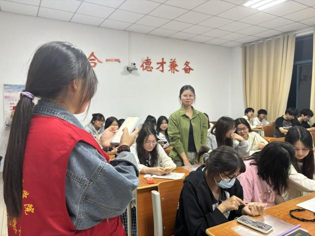 老师和大二志愿者以大学生校园安全为主题进行宣讲活动。防诈骗安全提示:结合高校诈骗典型案例,解析兼职刷单、虚假网贷、冒充客服等常见诈骗套路,传授“未知链接不点击、陌生账号不转账、个人信息不泄露”的防诈口诀。饮食安全:不买三无食品,通过看、闻、查等方式辨别问题食品,食物中毒分轻重处理,严重时需就医并留证。宿舍安全:重点强调用电安全,讲解火灾隐患排查方法,同时提醒学生注意宿舍财物保管,离开宿舍务必锁门,防止财产失窃等一系列校园安全知识。