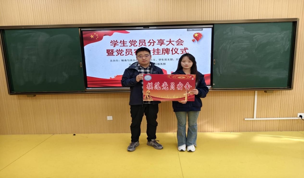 仪式伊始,学生党员曾铱灵结合自身学习与工作经历,分享成长感悟。她号召同学们厚植家国情怀,夯实专业根基,用先进理论武装头脑,以优良学风浸润宿舍,让“小宿舍”成为“大课堂”。随后,汤新元老师为曾铱灵同学授予“模范党员宿舍”称号并合影留念,勉励全体同学要从思想上、行动上、学习上向优秀党员学习。