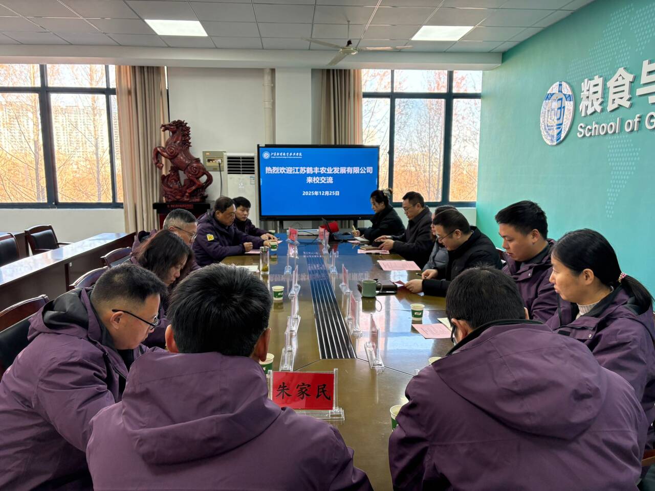 2025年12月25日,江苏鹤丰农业发展有限公司党支部书记、执行董事周宏奎,副总经理鲍立伟等一行10人来我院进行培训、交流。学院党总支书记浦海涛、院长田林双、副书记马栎、副院长吴存兵参加会议。会议由田林双主持。