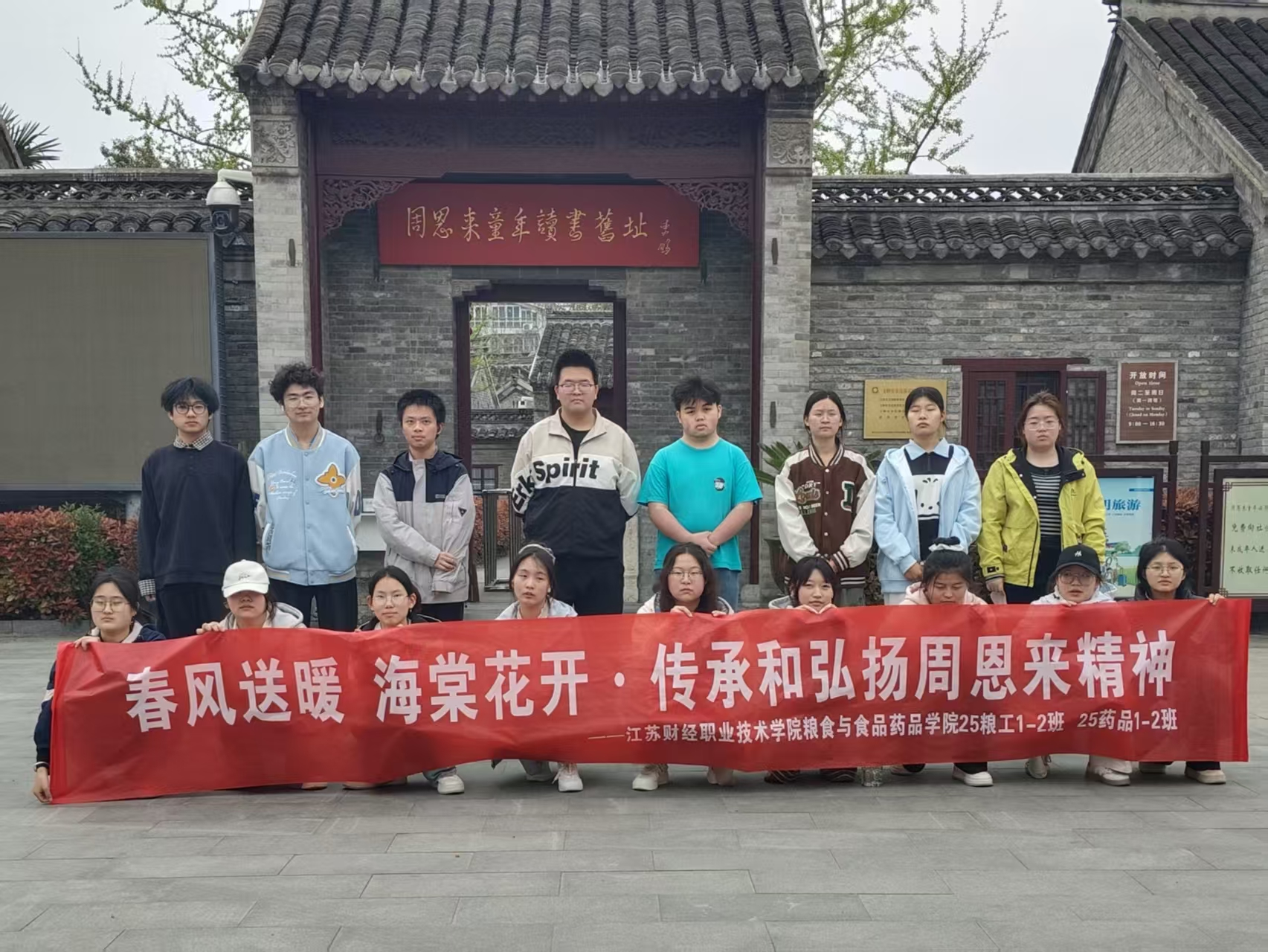 为纪念周恩来总理诞辰128周年,传承和弘扬周恩来精神,厚植青年学子爱国主义情怀,4月2日下午,粮食与食品药品学院25粮工1-2班、25药品1-2班组织学生代表前往周恩来童年读书旧址,开展“春风送暖,海棠花开”清明节祭扫与缅怀活动,专职辅导员汤新元参与本次活动。
