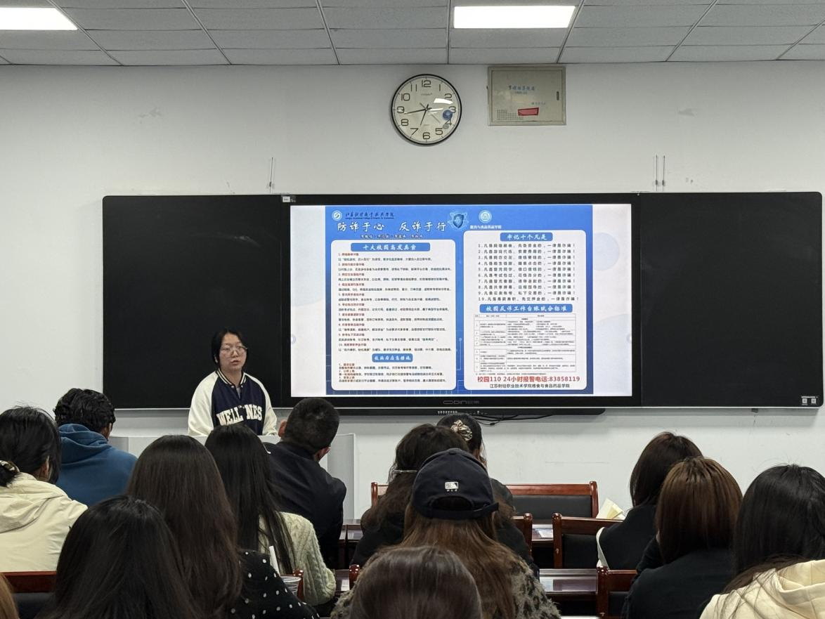 为切实筑牢校园安全防线,增强大学生反诈防骗意识与自我保护能力,4月23日晚,粮食与食品药品学院组织25粮工1-2班、25药品1-2班以及24、25级治保委员在诚行楼S5-417教室开展“防诈于心,反诈于行”主题班会。学校保卫处陈伟辉处长、学院党总支副书记马砾、学校保卫处周峰科长及专职辅导员汤新元参与本次活动。