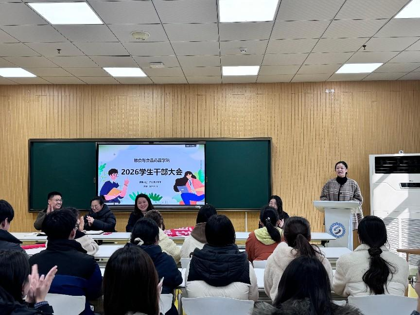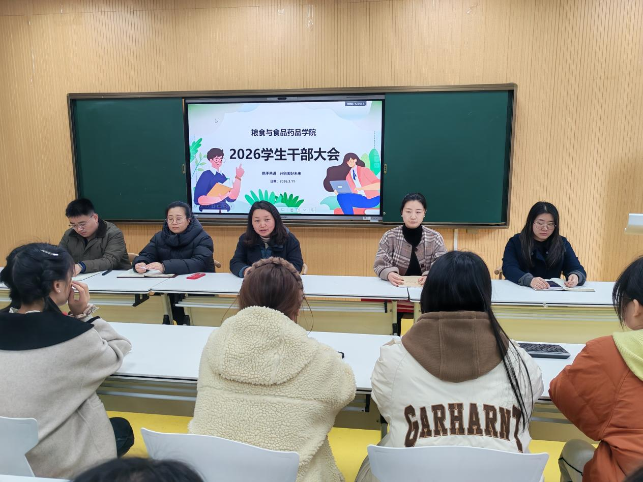 2026 年3月11日,粮食与食品药品学院2026年学生干部大会在五育中心思政教室召开。学院党总支书记浦海涛、副书记马栎,辅导员朱羽、汤韵慈、汤新元及院三委会全体学生干部参会,会议总结2025年学生工作,部署2026年工作规划。